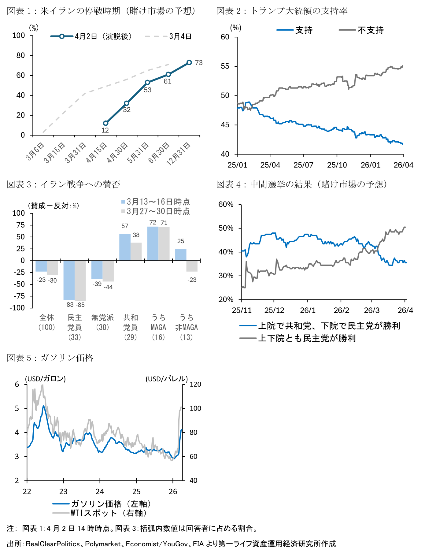 2月28日以降の米・イスラエルとイランの軍事衝突には解決の兆しがみえていない。賭け市場(Polymarket)の予想する停戦時期は4月中が32%に留まっている(図表1:演説後の4月2日14時時点)。一方、トランプ大統領が11月の中間選挙を見据える場合、夏休み前の6月中には原油価格を鎮静化させたい意向が強いとみられ、賭け市場でも6月までの停戦が61%の確率で予想されている。