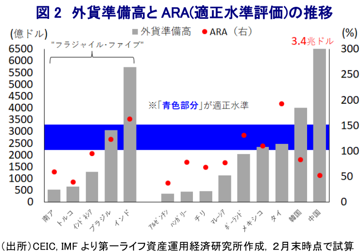 - 金融危機への発展を断定するのは時期尚早と見込まれるが、一部の新興国の外貨準備高はIMFが示す適正水準を下回り、資金流出の継続でさらに悪化している可能性がある。トルコでは中銀による金売却の動きも確認されており、耐性の低下が懸念される。過度な悲観は不要だが、こうした構造的脆弱性を念頭に置き、市場動向を冷静に見極めることが重要である。