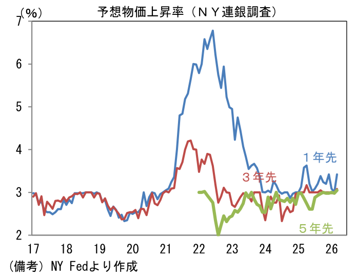 まずは米国。NY連銀が7日に公表した予想インフレ率は「1年先」が3.42%へと0.42%pt上昇した。ガソリン価格の上昇が消費者の予想インフレ率上昇に直結した形であった。一見すると、Fedの利下げを阻害する要因になりそうだが、中長期の予想インフレ率上昇は限定的であり、現時点ではFedが警戒するには至らないとみられる。「3年先」は3.08%へと0.08%ptの上昇、「5年先」は3.06%へと0.07%ptの上昇に留まった。4月8日の米国とイランによる「2週間停戦合意」を受け、原油価格は低下したものの、今後再び原油価格とガソリン価格が上昇すると、中長期の予想インフレ率上昇に発展し、Fedの金融政策に影響を及ぼすことも考えられる。ミシガン大学調査の予想インフレ率を含め、警戒感を高める必要があろう。
