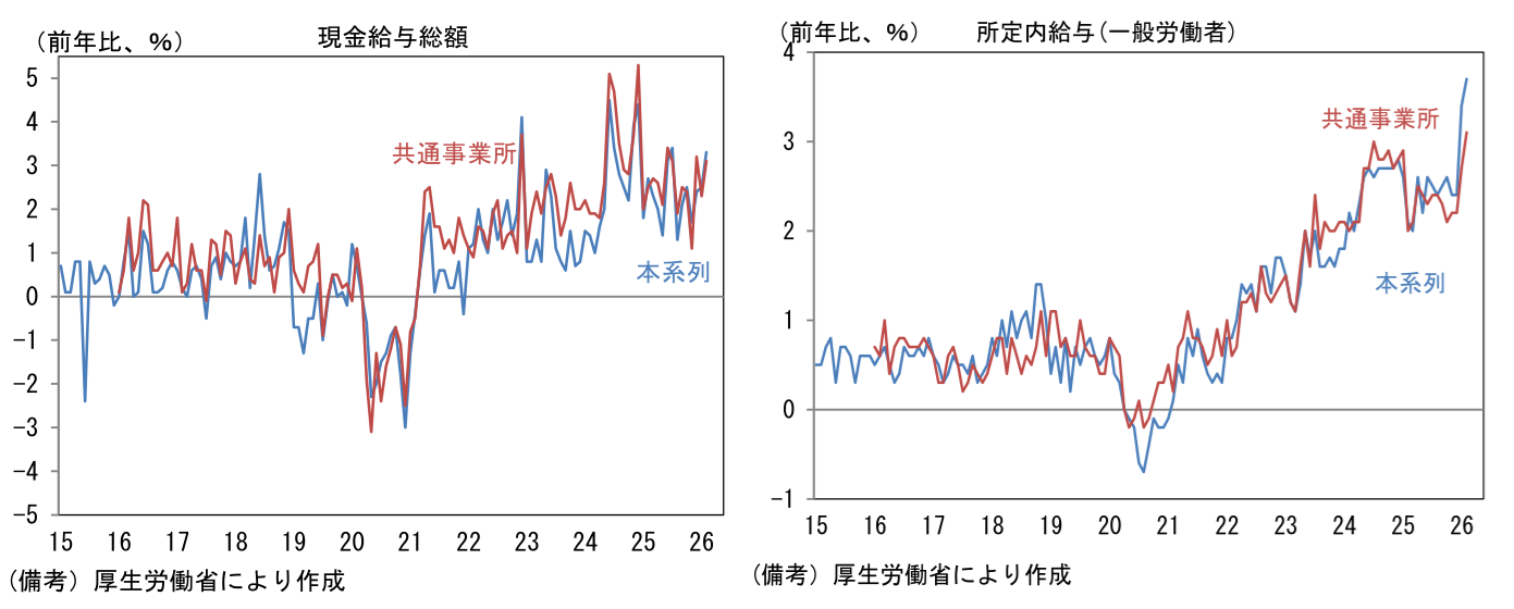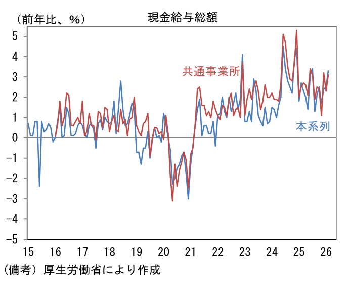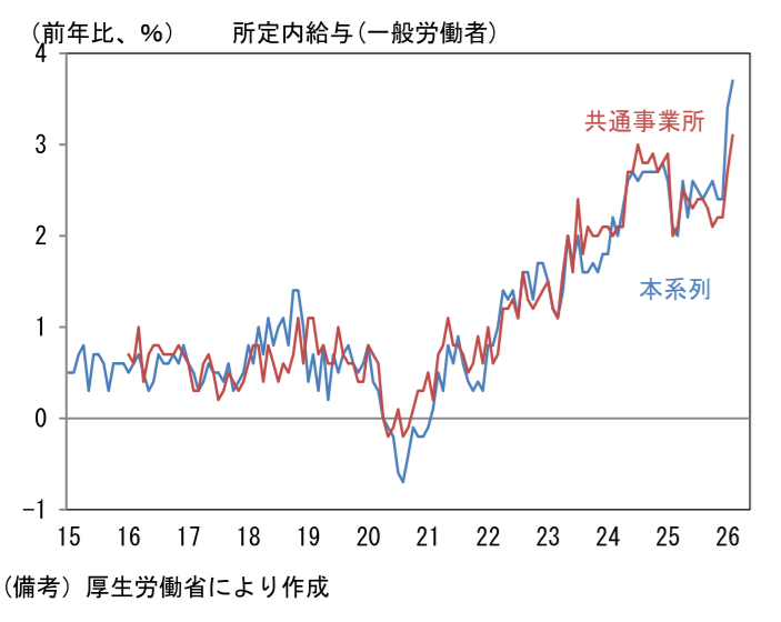 - そして2月の毎月勤労統計も大きな動きがあった。結論を先取りすると、日銀が疑っていた通り、統計のサンプル要因による下押しが解消し、賃金上昇率が(本来あるべき水準に向けて)加速した。ヘッドラインの現金給与総額(共通事業所ベース)は前年比+3.1%、所定内給与は+3.1%となった。一人あたり賃金の実勢を把握するうえで最も重視すべき、一般労働者の所定内給与(≒正社員の基本給)は同+3.1%へと復活を遂げた。毎月勤労統計を巡っては、2025年2月分以降に不可解な減速を示し、一般労働者の所定内給与は2024年度の3%程度から2%前半へと凹みが観察されていた。弱さが特定の業種に集中していたため、サンプル要因が疑われており、日銀も度々この点に言及してきたが、それを証明する手段・データは乏しかった。今回、定例のサンプル入れ替えによって賃金上昇率が高まったことで、日銀は基調的な物価上昇率が高まるとの見解をより強固なデータを以って説明することが可能になる。その点において利上げを後押しするデータであると言える。