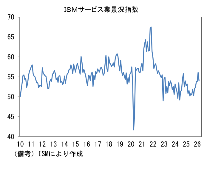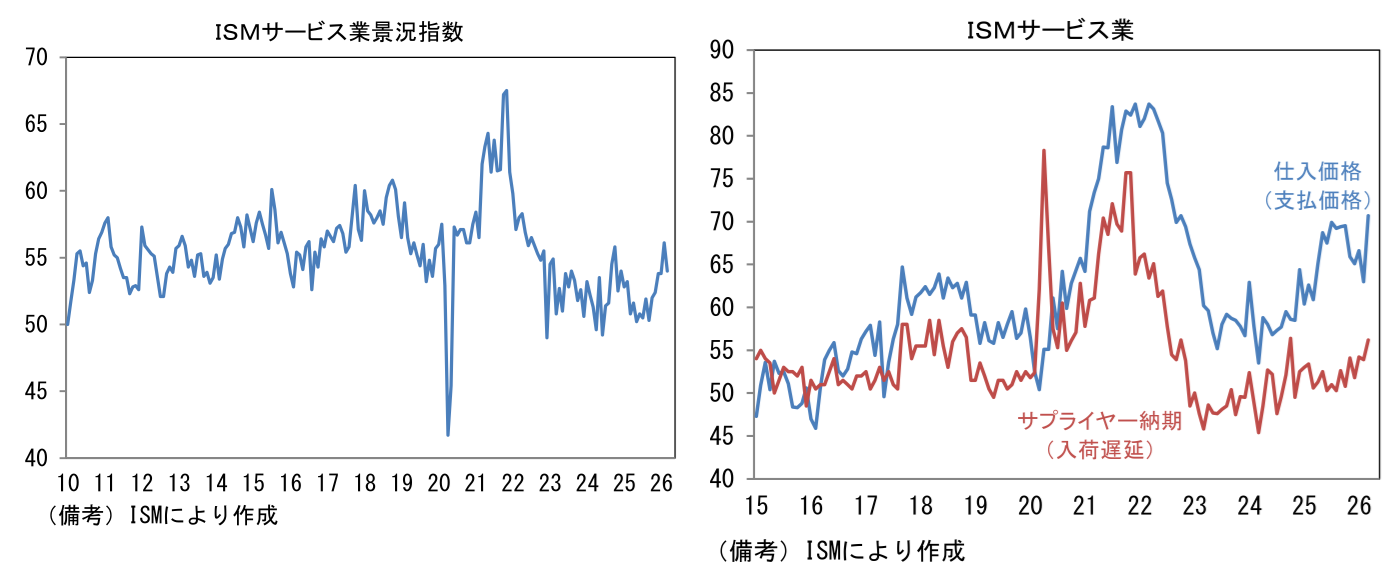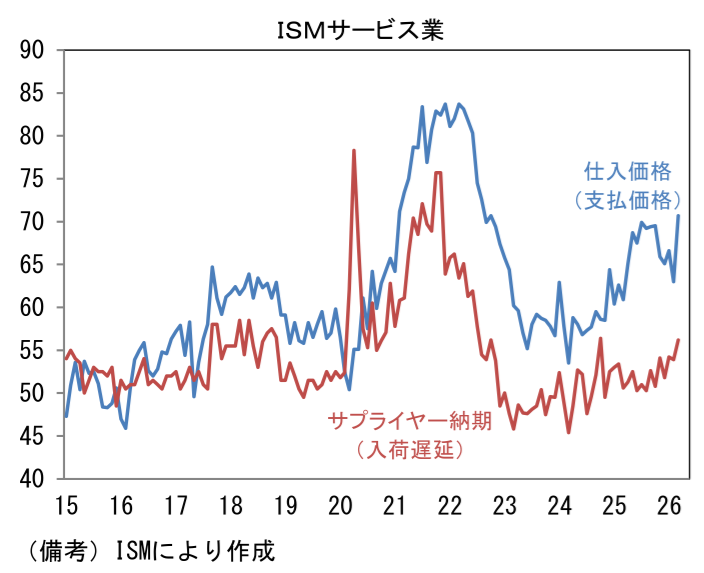 - 3月ISMサービス業景況指数はインフレ加速を示唆する結果であった。ヘッドラインは新規受注の伸びに支えられ、54.0と堅調な値を維持し、原油高による経済活動の減速は観察されなかったが、仕入価格指数は70.7へと7.7ptも跳ね上がっており、今後の原油高影響が懸念される。関税由来の上昇が一服するなか、原油高由来の価格上昇圧力が高まっていることが窺える。原油価格が2月水準まで戻るまでには相応の時間がかかると見込まれることから、当面は利下げを阻害する要因の一つになるだろう。なお、筆者は賃金インフレが抑制されていることを重視し、9月には利下げの環境が整うと判断している。