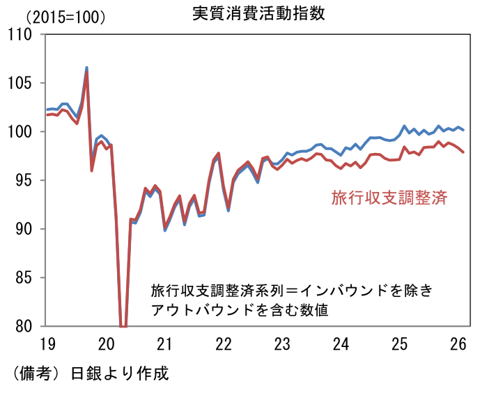 - 次に日本。今週は3つの指標が比較的大きな動きをみせた。まず、4月7日に日銀が公表した2月消費活動指数は弱かった。実質消費活動指数(旅行収支調整済み)は前月分の下方修正を伴い2ヶ月連続の減少となり、基調は下方屈折。1月までの上向き基調は塗り替えられた。名目値でみても横ばいであり、家計の節約志向が浮き彫りとなっている。振れの大きい耐久財が消費の減少を主導しているため、次月以降に反発する可能性は残されているが、それでも全体の数値が上向きに転じるかは慎重に見た方が良いだろう。もちろん、こうしたデータは日銀の利上げを阻害する要因となる。