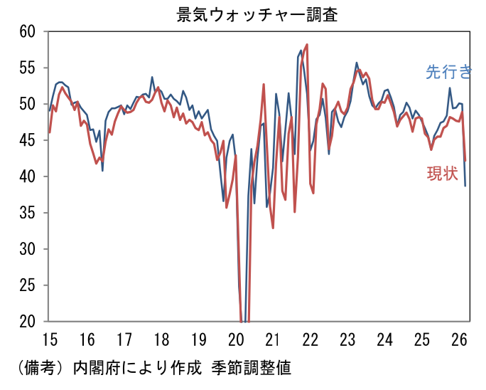 - 次に4月8日に発表された3月景気ウォッチャー調査は市場予想を大幅に下回る衝撃的な弱さであった。現状判断DIは42.2へと6.7pt低下し、市場予想(48.0)を大幅に下振れた。先行き判断DIに至っては38.7へと11.3ptもの低下となり、市場予想(48.0)を下回った。この指標の調査時期は毎月25日~月末であり、3月中下旬のガソリン高が直撃していた頃にあたる。その後、政府の補助が浸透しガソリン価格は落ち着いていることから、調査時期が1~2週間遅ければ、ここまでの急低下には至らなかったと思われるが、それでも原油高に対する脆弱性を浮き彫りにする数値であった。このデータも日銀の利上げを阻害する要因となる。