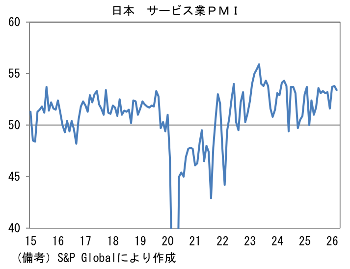 - 他方、類似指標のサービス業PMIは強かった。ヘッドラインは53.4へと0.4pt低下したものの、原油高影響はほとんど観察されなかった。当指標は小売業を調査対象としていないことから、BtoC段階で生じている「不安」を過小評価している可能性があることを踏まえる必要があるが、こちらの方が実体を反映している印象がある。
