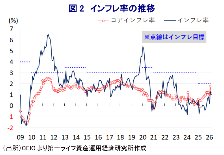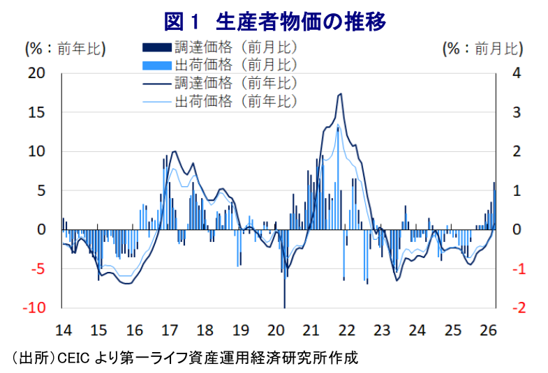 消費財への価格転嫁が難しいことを反映して、3月の消費者物価は前年同月比+1.0%と、前月(同+1.3%)から伸びが鈍化している。前月比も▲0.7%と前月(同+1.0%)から4ヶ月ぶりの下落に転じた。2026年は春節(旧正月)連休の時期が前年から大幅に後ずれするとともに、日数が多かったことも影響している。春節連休の影響が一巡したことを反映して、豚肉(前月比▲7.3%)や野菜(同▲10.1%)、果物(同▲3.3%)、卵(同▲2.7%)、水産品(同▲2.6%)など生鮮品を中心に軒並み食料品価格が下落した。その一方、原油高を反映してエネルギー価格の上昇圧力が強まるなか、政府は激変緩和措置として価格抑制策に動いているものの、自動車用燃料(前月比+10.0%)は大幅に上昇するなどすでに影響が顕在化している。食料品とエネルギーを除いたコアインフレ率も前年同月比+1.1%と前月(同+1.8%)から鈍化しており、消費者物価全体のインフレ率とともに中銀目標(2%)を下回る推移が続いている。前月比も▲0.7%と前月(同+0.7%)から5ヶ月ぶりの下落に転じた。春節連休の影響が一巡したことを反映して幅広くサービス価格に下押し圧力がかかるとともに、食料品以外の財価格も下落する動きが確認されるなど、デフレ基調が続いている。足元の企業マインドの動きをみると、製造業、サービス業問わず幅広い分野で雇用調整圧力が強まる動きが確認されており、エネルギーなど生活必需品を中心とする物価上昇が実質購買力の下押し圧力となることが懸念されるなか、家計部門の節約志向が一段と強まることも予想される。