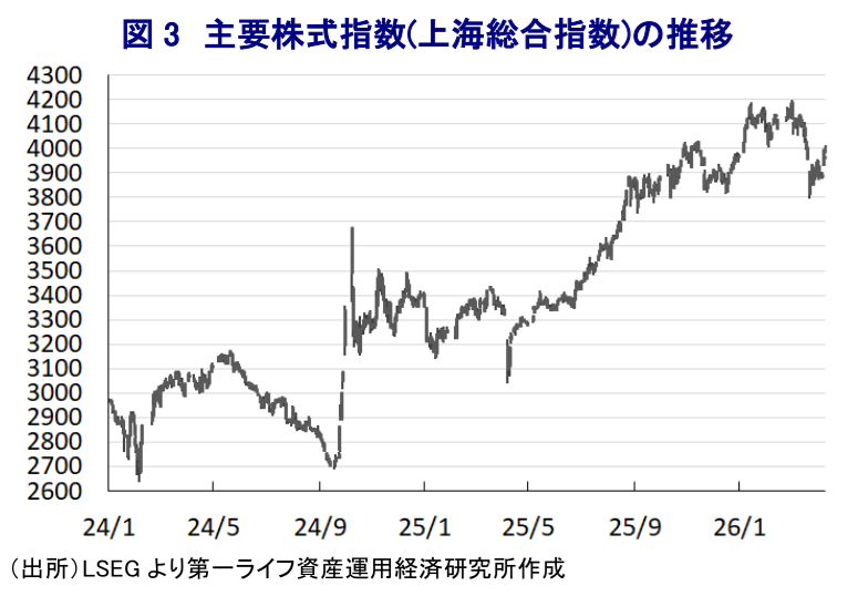 足元の中国国内では、企業部門は中東情勢の緊迫化を理由にインフレ圧力に直面する一方、家計部門は雇用不安や生活必需品を中心とする物価上昇が懸念されるなかで節約志向を強めるなど、デフレマインドが根強い対照的な状況にある。家計部門が節約志向を強める背後には、資産に占める割合が高い住宅価格が下落基調を強めるなど資産デフレに伴うバランスシート調整圧力に直面していることも影響している。3月の全人代(第14期全国人民代表大会第4回全体会議)では、不動産市場に関連して、在庫の買い取りによる保障性住宅の供給拡大、積立金制度の改革深化、引き渡し保障に向けたホワイトリスト制度の拡充による債務不履行リスクの抑制といった方針が示された。しかし、これらは過去に実施された施策の域を超えておらず、深刻な状況が続く不動産不況の脱却に向かうかは不透明である。このように、物価を巡る企業と家計の「温度差」が続くことが企業業績の圧迫要因となることで、活況をみせてきた市場環境に影響を与える可能性にも注意が必要である。