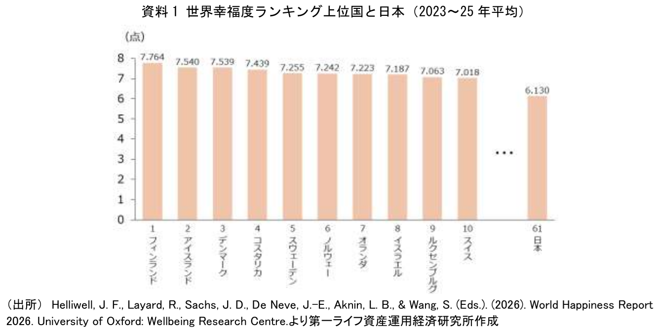 2026年の報告によると、世界幸福度ランキング(2023~25年の直近3年平均)で最も幸福な国はフィンランドの7.764点で、9年連続の首位となっている(資料1)(注1)。 2位アイスランド、3位デンマーク、5位スウェーデン、6位ノルウェーなど毎年北欧諸国が上位にランキングされている。日本は6.130点で147か国中の61位であった。