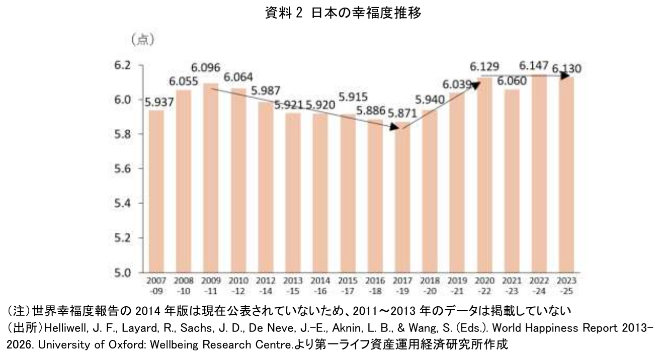 2026年版では、フィンランドが7.764点で9年連続首位となり、アイスランドやデンマークなど北欧諸国が上位を占めた。日本は6.130点で147か国中61位だったが、重要なのは順位そのものではない。長期推移でみると、日本の幸福度はリーマン・ショック後にいったん低下した後、近年は持ち直し、直近では過去最高水準を維持している。日本の幸福度を考えるうえでは、国際的な順位よりも、時系列の変化とその背景を丁寧に捉える視点が必要である。