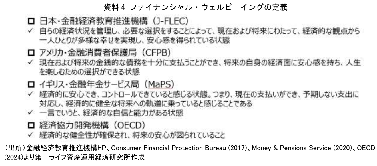 FWBについては、日本の金融経済教育推進機構(以下、J-FLEC)を始め、アメリカやイギリス、OECDといった公的な機関がそれぞれ定義を行っている(資料4)。最大公約数的にまとめていうと、FWBとは、「世帯収入に対する主観的満足度であり、経済的な安心感を持ち、現在から将来にかけて人生を楽しむための選択ができる状態」といえる。