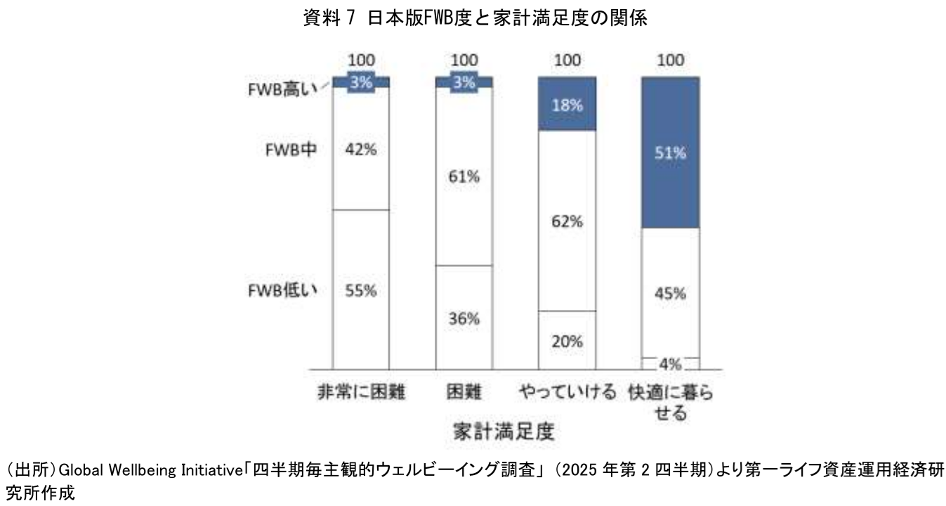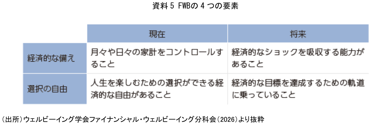 こうした分析結果を踏まえ、本稿ではファイナンシャル・ウェルビーイング(FWB)の重要性を示す。FWBとは、単に貯蓄や投資を増やすことではなく、現在から将来にわたって経済的な安心感を持ち、自分らしい選択ができる状態を指す。お金を人生の目的ではなく、よりよく生きるための手段として捉える視点が重要である。