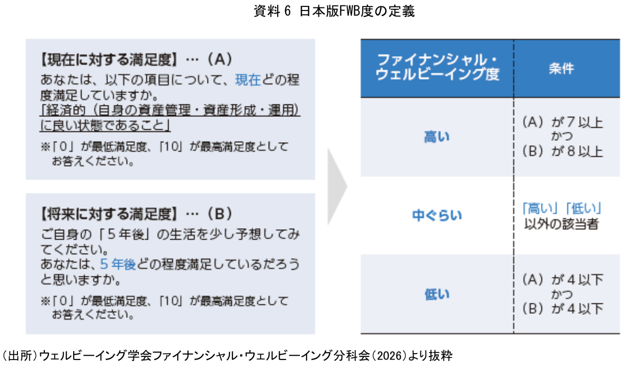 ウェルビーイング学会ファイナンシャル・ウェルビーイング分科会では、FWBの度合いを測定する指標として、日本版ファイナンシャル・ウェルビーイング度(以下、FWB度)という指標を設定し、測定している(資料6)。具体的には、「資産形成や資産活用など、足元および将来の計画」について、現在および将来の満足度を0~10点で聴取し、右側のような条件で、高い、中ぐらい、低いの3段階に区分している。