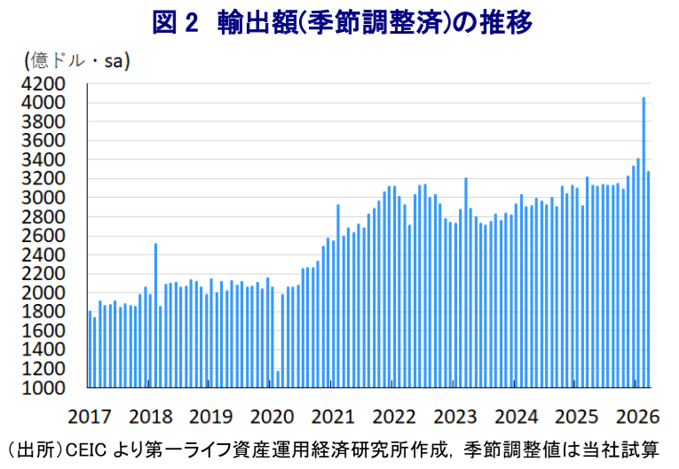 3月単月の統計をみると、輸出額は前年同月比+2.5%と1-2月(同+21.8%)から伸びは鈍化している。なお、2026年は春節(旧正月)の時期が前年に比べて大幅に後ずれするとともに、連休日数も多かったことに留意する必要がある。こうした事情も影響して、当研究所が試算した単月ベースの前月比も5ヶ月ぶりの減少に転じるなど底入れの動きに一服感が出ているものの、中期的な基調は拡大傾向で推移するなど底堅い動きが続いている。中東情勢の緊迫化を受けて、中東向け輸出に悪影響が出ている可能性は高いものの、ウクライナ戦争以降に関係深化が続くロシア向け(前年比+20.6%)は高い伸びが続いている。世界的なAI(人工知能)に関連する半導体関連需要の旺盛さなども追い風に、台湾向け(前年比+35.2%)や韓国向け(同+19.6%)も高い伸びをみせており、ハイテク関連の輸出を押し上げているとみられる。米国との関係悪化の背後で輸出を拡大させてきたインド向け(前年比+12.7%)のほか、EU向け(同+8.6%)、ASEAN向け(同+6.9%)、アフリカ向け(同+3.1%)はいずれも伸びが鈍化したものの、依然として前年を上回る伸びが続いている。なお、米国との関係改善期待に加え、米連邦最高裁による違憲判決を受けたトランプ関税の「衣替え」により税率は事実上引き下げられたものの、米国向け(前年比▲26.5%)は大幅マイナスとなるなど、本格回復は道半ばと捉えられる。財別では、ハイテク関連(前年比+31.4%)のほか、電気機械関連(同+11.2%)で旺盛な動きが続くなど、中国製品に対する需要の高さがうかがえる。