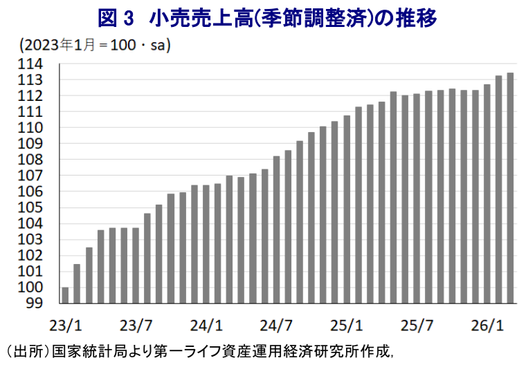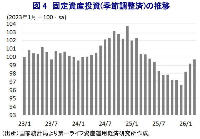 全人代では、2026年から始まる第15ヵ年計画の重大戦略課題のひとつに内需拡大を掲げる方針が示された。そのうえで、国内大循環(内需主導による経済循環)の実現に向けた消費喚起に加え、高質量発展の強化を目指して双循環(内需主導型の成長、自給自足の強化、世界における中国依存度の向上)を円滑化するとした。さらに、2026年の経済政策についても、内需拡大や供給力の最適化、新質生産力(新たな質の生産力)の育成を推進する考えを示した。また、より積極的な財政政策と適度に緩和的な金融政策を継続するとしたものの、足元の企業マインドは幅広い分野で雇用調整を示唆する動きが確認されるなど、内需の足かせとなることが懸念される状況にある。3月の小売売上高は前年同月比+1.7%と1-2月(同+2.8%)から伸びが鈍化した。前月比も+0.14%と拡大基調は続いているものの、前月(同+0.49%)からペースは鈍化しており、個人消費は力強さを欠いている。なお、1-2月の統計公表に際しては、2025年の季節調整値が遡って上方修正されて「拡大の動きが続いていた」とされたものの、今回の公表に際して軒並み下方修正された結果、実態は「ほぼ横這いであった」と判断せざるを得ない状況にある。景況感の動きなどを勘案すれば、新たな数値の方が実感に近いと捉えられ、正しい景気認識につながることが期待される。しかし、経済指標が公表されるたびに修正が行われることは、適時適切な政策運営の阻害要因となる可能性に注意が必要である。