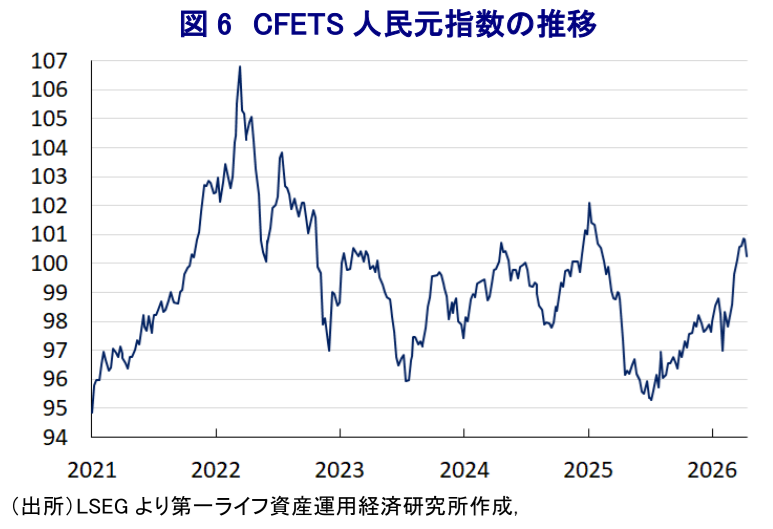 前述のように、中国当局は2026年の経済成長率目標を+4.5~5.0%とするなか、1-3月はこの上限をクリアするなど良好なスタートを切ったと捉えられる。こうした状況について、国家統計局は「苦労して勝ち取ったもの」と評価するとともに、先行きについて「原油高が中国経済に与える影響は比較的小さい」との見方を示している。しかし、中国では原油や石油製品、天然ガスなどエネルギー資源の収支(輸出入の差し引き)はGDP比▲1.9%程度の赤字と試算される。よって、原油高はマクロ面で景気の足を引っ張ることは避けられない。さらに、中国の湾岸産油国向け輸出額はGDP比0.8%程度と試算されるため、中東情勢の長期化により輸出に下押し圧力がかかることの影響も避けられない。金融市場では、人民元相場は緩やかに上昇する動きが続いているうえ、主要輸出相手国通貨を加味した通貨バスケット(CFETS人民元指数)は上昇ペースを強めるなど実質的な人民元高の動きがみられる。人民元高は輸入物価の抑制を促す一方、輸出競争力の低下を招いて外需の足かせとなることが懸念され、先行きの中国経済にとって不透明要因となる可能性がある。ここ数年の中国景気は様々な面で「K字型」の様相を呈しているが、先行きはその傾向が一段と強まる可能性がある。