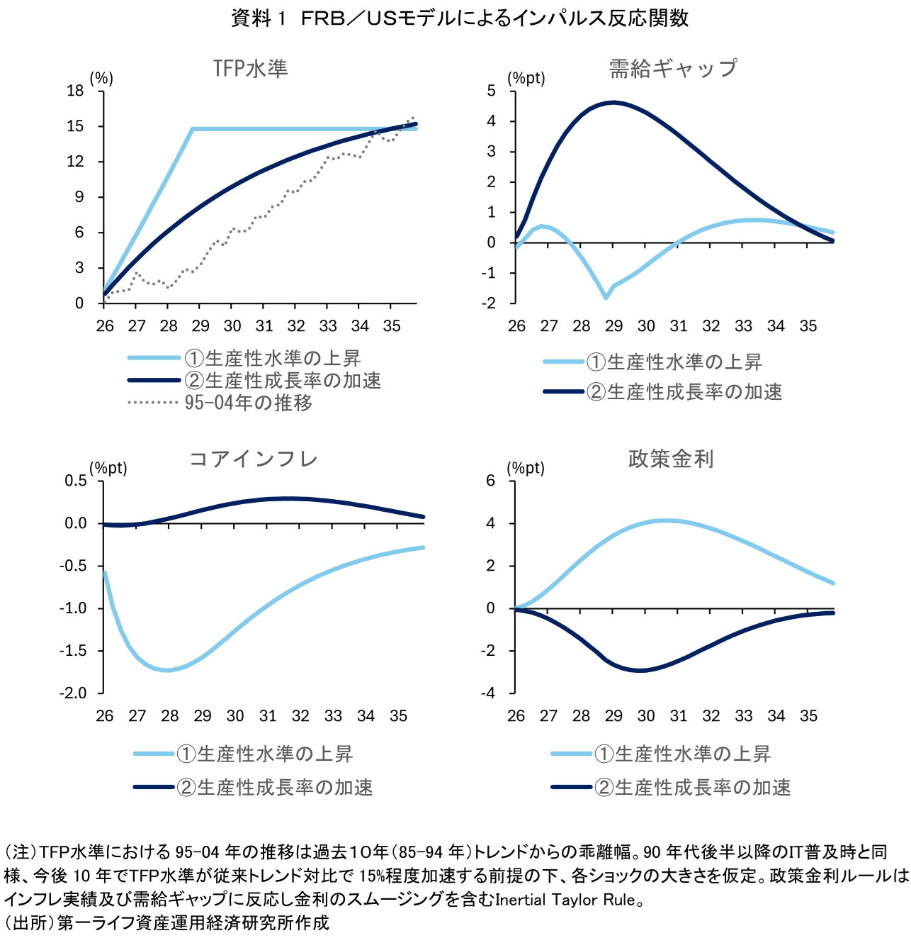 2025年11月のWall Street Journalへの寄稿において、ウォーシュ氏は「AIは生産性向上と米国の競争力強化を通じ、大きなインフレ抑制要因になる」と指摘した。一方、複数の現FRB理事は「AI普及=利下げ」との考えに慎重な見方を示している。こうした見解の相違は、AIによる供給力の拡大に対して、需要がどれだけ先んじて伸びると考えるかの違いに起因する。FRBによるマクロ経済モデル(FRB/USモデル)のシミュレーションでは下記の通り整理できる(資料1)。なお、ここでの生産性は全要素生産性(TFP)を意味する。