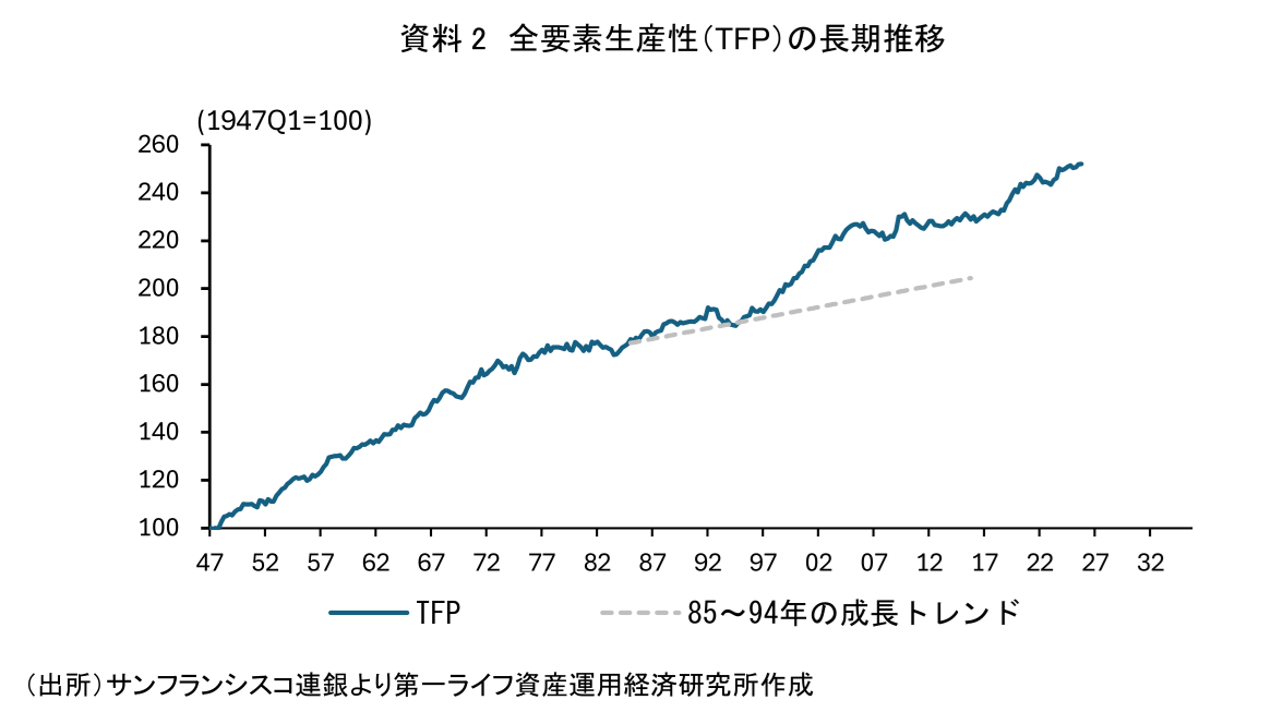 ① 生産性水準の上昇:生産性水準の上昇は経済の供給力を直ちに高め、需給ギャップをマイナスへと転化させる(需要<供給)。これはインフレ率を抑制する要因となり、FRBに利下げを促す。