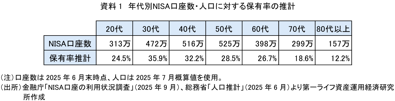 まず、NISA貧乏の前提となるNISAの利用状況について整理する。資料1は、人口に対するNISA口座保有率の推計である(2025年6月末時点)。30代では、約3人に1人が口座を保有している。ただし、2024年は約3割が、年内に一度も買付を行っていない未稼働口座であった(注1)。それ以前、旧NISAの時には買付を行っていたというケースもあるが、口座を開設しても実際の取引に至らない人が一定数存在する状況は、以前より課題となっていた。こうした状況も踏まえると、NISAの普及は進んでいるものの、投資をしている人は依然として少数派といえる。