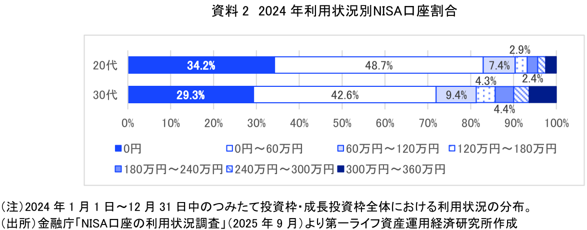 また、金融庁(2025)によると、2024年における、20代・30代のNISA利用者における年間投資額は「0円超〜60万円以下」がボリュームゾーンであった(資料2)。日本証券業協会(2026)でも、つみたて投資枠における購入金額が年間20万円未満の割合は、20代51.5%、30代43.7%であり、実際に投資をしている若年層の多くは、少額からの長期・積立投資を促進するというNISAの制度趣旨に沿った行動をしているとみられる。