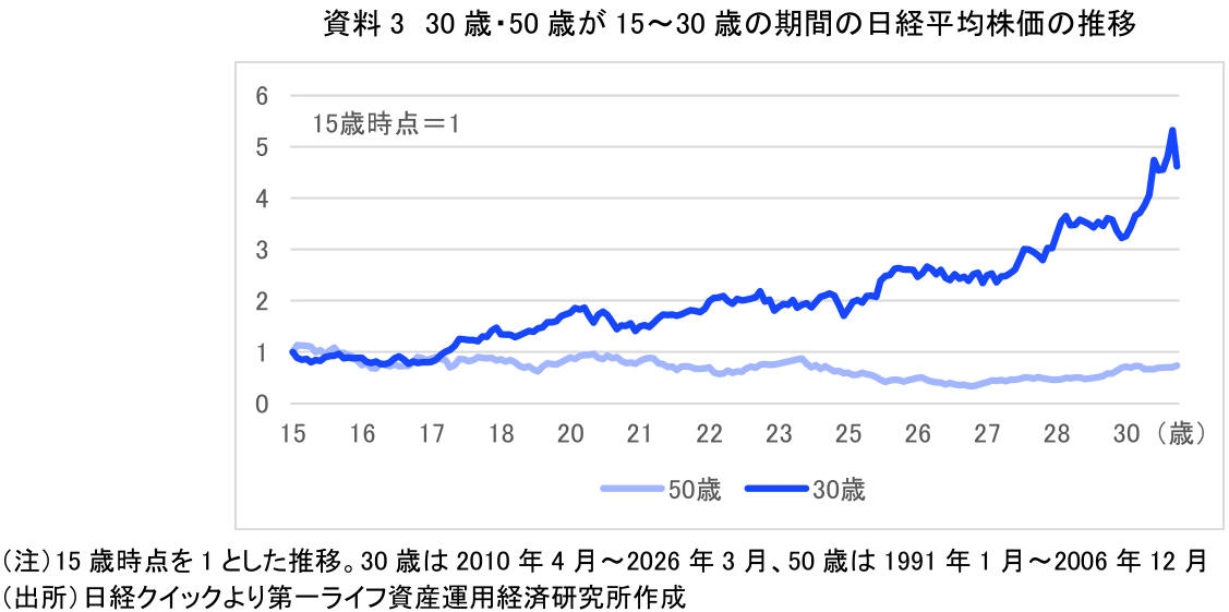 若年層とその上の世代では、経験した相場が全く異なる。現在30歳と50歳それぞれについて、社会に関心を持ち始める15歳~30歳までの日経平均株価の推移を、15歳時点を1として示したものが資料3である。50歳では15年間にわたり1を下回る期間が長く、長期的な低迷が続いていた。一方、30歳は同期間に5倍近く上昇した。さらに、新NISA開始以降、株価は一段と伸びている。実際に、日本証券業協会(2026)によると、2025年のつみたて投資枠において実現損益がマイナスであると認識している人はわずか2.8%にとどまる(注2)。