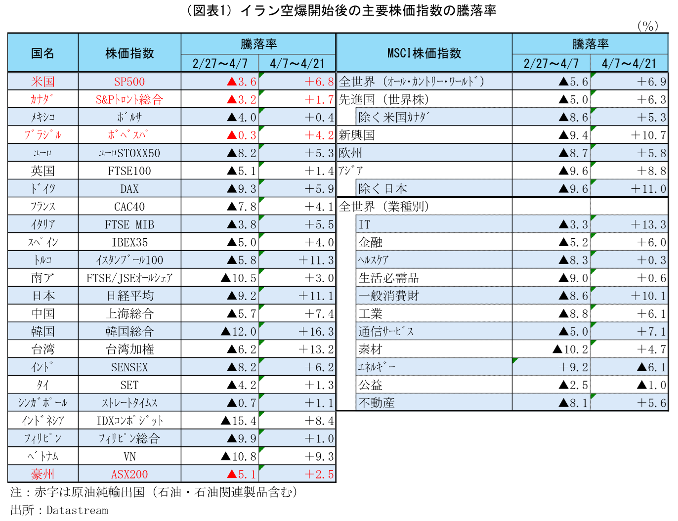 世界の主な株式指数の騰落状況を見ると(図表1)、全般的に2月28日の空爆開始後値下がりが大きかった国ほど、停戦協議開始で合意した後(4月7日を起点とし、4月21日まで)の上昇率が大きくなっていることが分かる。特に、日経平均や韓国総合、台湾加権などは二桁の上昇率を記録するなど突出している。一方、MSCI全世界株の業種別指数を見ると、空爆開始後に唯一上昇していたエネルギー業が下落に転じる一方、それ以外の業種の株価指数は公益を除いて上昇に転じている。なお、この間WTI原油先物価格は▲19.9%下落した。