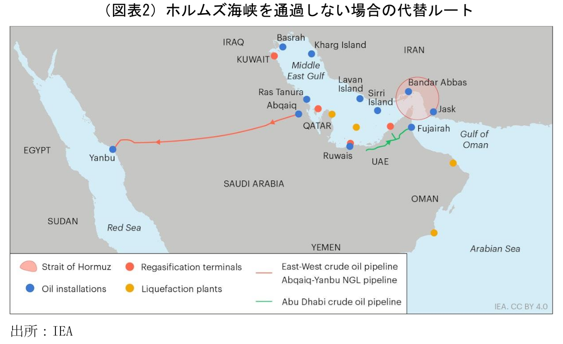 これに対し、トランプ米大統領は22日としていた交渉の期限を延長することを表明した。新たな期限は示しておらず、交渉が再開されなかったとしても、このままであれば事実上無期限の停戦状態が続くことになる。とはいえ、世界経済やマーケットにとって最も重要なポイントは、原油の供給が抑制された状態がいつ終わるのかという点だ。停戦状態が続く間に、イランの攻撃によって破壊された中東諸国の石油関連施設はいずれ復旧するとしても、ホルムズ海峡を経由しない代替ルートでの原油輸出には限界がある。ホルムズ海峡が封鎖される前、同海峡を経由して世界に供給される原油の量は一日あたり約2000万バレルだった。これに対し、同海峡を経由しない代替ルートで振替輸出可能な原油量は一日あたり約400万バレル程度とされている(図表2)。また、そもそもホルムズ海峡に依存しない世界の原油余剰生産能力も300~500万バレル程度と見積もられている。従って、ホルムズ海峡の封鎖が続く間は、世界の原油消費の約10%に当たる1000万バレル以上は不足する状態が続くことになる。