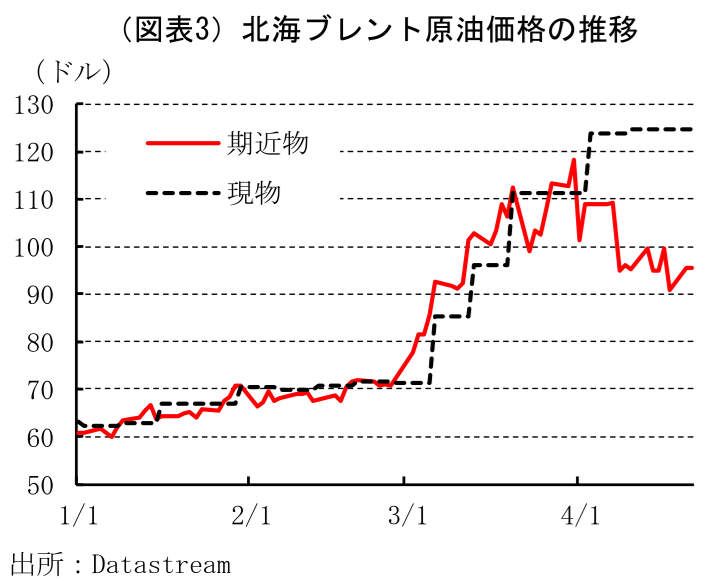 こうした状況は原油相場の先物価格と現物価格の格差として現れている。たとえば、北海ブレント原油の先物価格は米国とイランが停戦交渉を開始したことを受けてピークアウトしている一方で、現物価格は高止まりしており、足元の原油需要が非常に強いことを示している(図表3)。