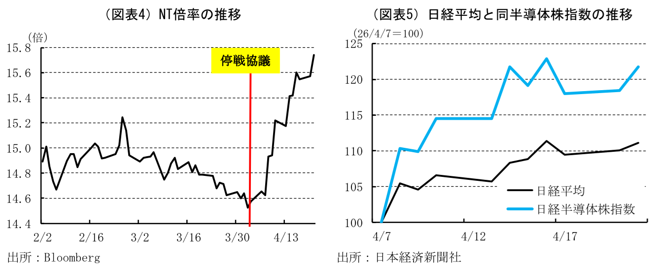 同様の傾向は日本株でも確認される。停戦開始以降はNT倍率が急上昇しており、ハイテク株のウェイトが相対的に高い日経平均株価指数の上昇率がTOPIXを上回っていることを示している(図表4)。さらに、日経平均株価と日経平均半導体株指数を比較すると、半導体株指数の上昇ペースは日経平均全体の倍近いことが分かる(図表5)。