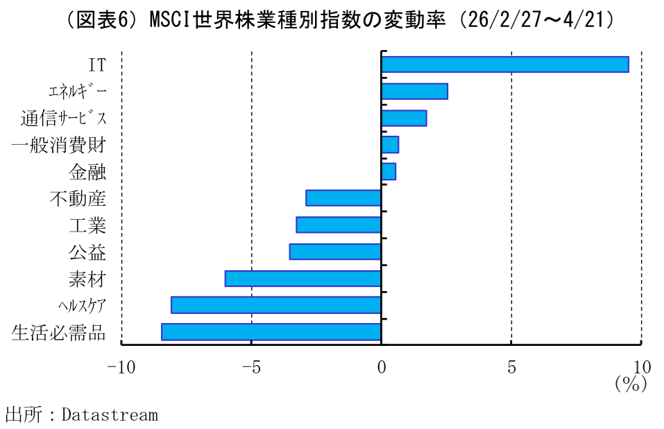 MSCIの業種別株価指数の水準を見ると、IT株はイランへの空爆が開始される直前の2月27日対比で+9.5%上昇する一方、その他の業種は僅かな上昇、ないしは下回った水準にとどまっている。このことは、ハイテク株以外の業種については、前述したように停戦という局面の変化による反動の域を出ておらず、現状が長期化すれば再び下落するリスクがある(図表6)。