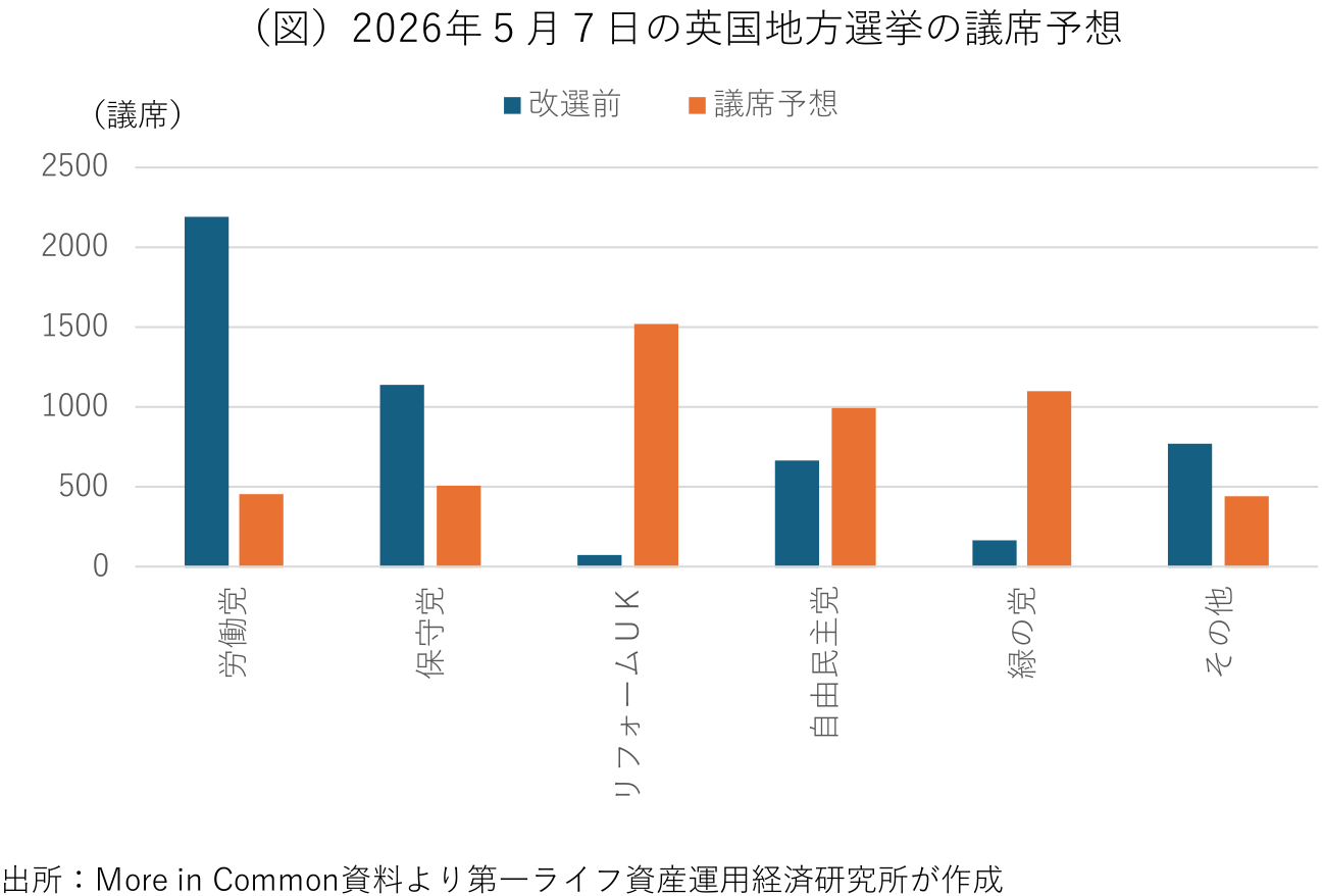 2024年の総選挙で14年振りに政権に返り咲いた労働党に対して、英国民から厳しい視線が注がれている。スターマー氏を首相として評価するかを尋ねた最新の世論調査では、「評価する」との回答が20%前後にとどまったのに対して、「評価しない」との回答が70%程度と大きく上回る。政権交代後に行われた2度の下院補欠選挙では、何れも労働党が保持していた議席を、政権奪取を視野に入れる右派ポピュリスト政党「リフォームUK」と、穏健左派票の受け皿となっている環境政党「緑の党」に明け渡した。2025年5月の統一地方選挙では、労働党の得票率は19%にとどまり、リフォームUKが改選議席の41%を獲得し、10の自治体で首長を輩出した。5月7日に控える統一地方選挙でも労働党の苦戦は避けられない。4月の世論調査では、労働党と保守党の二大政党が改選議席の半分以上を失うのに対して、リフォームUK、緑の党、中道リベラル政党「自由民主党」が議席を伸ばすことが予想されている(図)。
