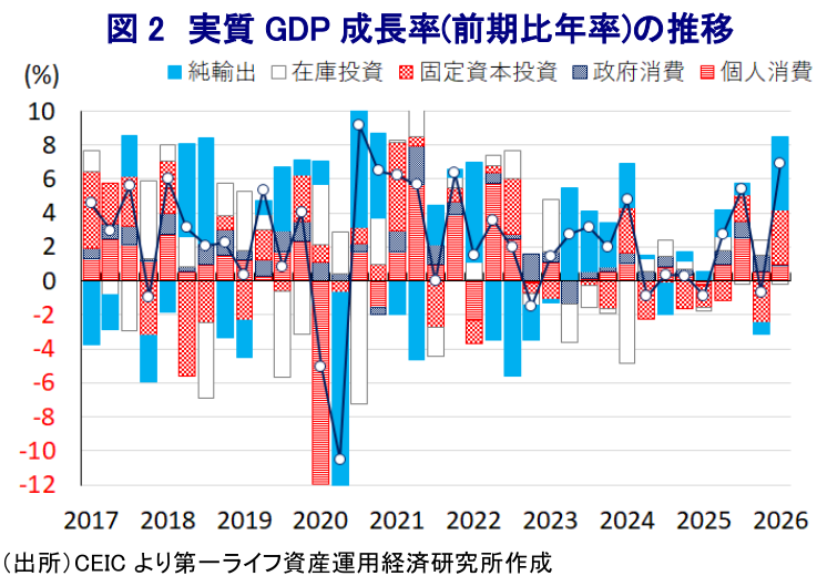- 中東情勢の悪化にもかかわらず、1-3月の実質GDP成長率は前期比年率+6.95%とコロナ禍直後以来の高い伸びとなった。世界的なAI関連需要の拡大が半導体輸出や設備投資を押し上げる一方、個人消費は力強さを欠く。政府は補正予算を通じて景気を下支えするが、原油高によるGDPの押し下げが懸念され、下振れリスクへの警戒が必要になる。