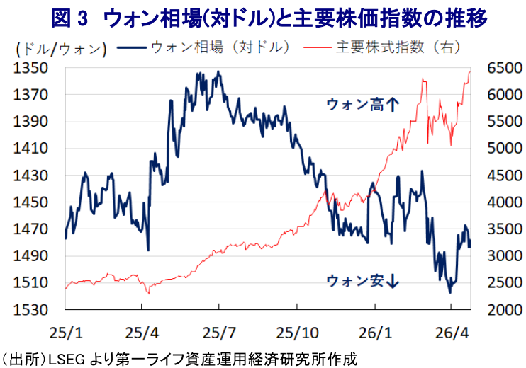 こうした状況のなか、韓国金融市場においては主要株価指数(KOSPI)が最高値を更新するなど活況を呈する動きがみられる。2025年に誕生した李在明(イ・ジェミョン)政権は、尹錫悦(ユン・ソンニョル)前政権が実施したコーポレートガバナンス(企業統治)改革の取り組みを維持したうえで、韓国企業の相対的低評価(コリアディスカウント)の解消に向け、商法改正などの取り組みを進めてきた。そのうえ、政府は2025年末に個人投資家を対象に、保有する海外株式を売却して国内株式に1年間投資した場合、譲渡所得税を時限的に免除するなど投資促進を図る動きをみせた。中東情勢の緊迫化を受けて主要株価指数は一旦大きく調整したものの、その後は一連の投資環境整備に加え、景気をけん引する世界的なAI関連投資の拡大期待が時価総額上位の半導体関連株を中心に株価上昇の動きを引っ張っている。足元のウォン相場は持ち直しの兆しがみられるものの、主要株価指数が最高値を更新する状況とは対照的な状況が続く。国民年金公団は2025年末に『新たな戦略的為替ヘッジ』を導入するなどウォン安阻止に向けた動きが広がりをみせているものの、若年層を中心にウォンに対する不信感が根強く残るとされ、結果的にウォン安圧力がかかりやすい状況が続いている。原油高が長期化すれば、対外収支や物価、財政の悪化など経済のファンダメンタルズ(基礎的条件)の脆弱さが増すことで、ウォン相場が揺さぶられる展開も予想される。