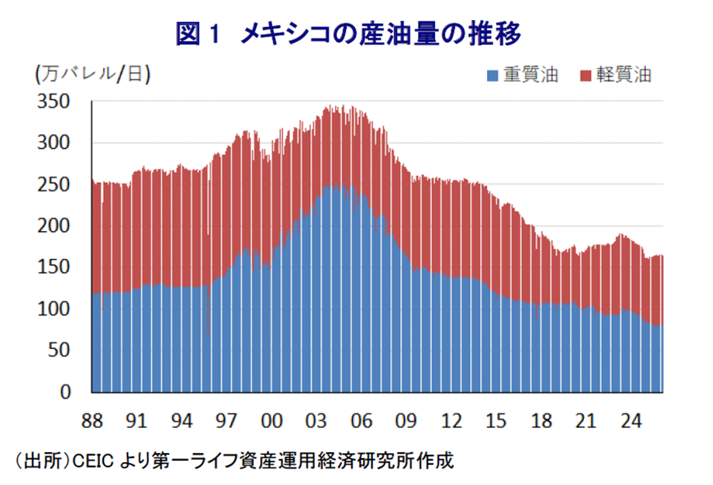 メキシコの産油量のうち日量140万バレルは国内精製向けのため、残余分を日本に輸出する形で一定期間に100万バレルを供給するとした。ただし、メキシコの産油量はピークから半減し、国内精製能力も不足しており、石油製品を輸入する構造にある。化石燃料への高い依存と原油収支の赤字も重なり、原油高はメキシコ経済の下押し要因となり得る。こうしたなかでの日本への供給決定は大きな意義を持つ一方、日本の精製施設は重質油向けが主流であるなか、メキシコの重質油生産が減少しており、今回の措置は持続的ではない。現状、日本は需要抑制に動いていないが、中東情勢の長期化懸念もあり、その検討が急務になっている。