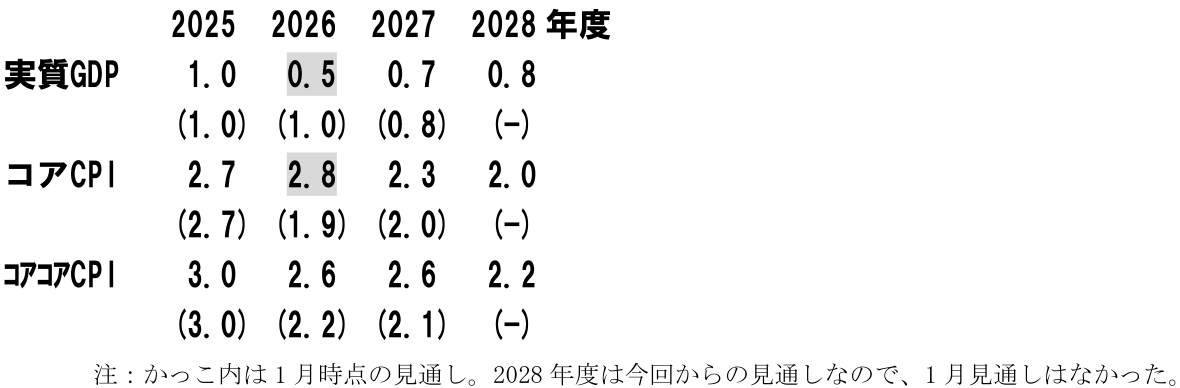 この数字をみて特徴的なのは、2026年度の成長率が前回1.0%から今回0.5%へと下方修正されている点と、同じく2026年度のコアCPIが前回1.9%から2.8%へと大きく上方修正されている点である。