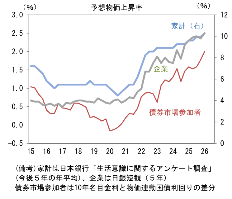 日銀は「基調的な物価上昇率が2%に近づいている」ことを今回の展望レポートで認めている。物価の上振れリスクが意識されるなか、日銀は、予想物価上昇率が(日銀の目標である2%近辺に)アンカーされているか否かを計測するうえで、人々の予想インフレ率を一段と注視するだろう。2022年の原油高局面においては、それ以前の物価上昇率が低かったことから、インフレがインフレを呼ぶ展開は回避されたが、基調的な物価上昇率が2%に近づいている現状、ここから予想インフレ率が一段と上向くようだと、いよいよ物価の上振れシナリオが現実味を帯びる。日銀が利上げペースを「半年に一度」から四半期などへと早めるとしたら、予想物価上昇率の上放れが考えられる。